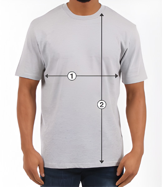 Measurement 2 (Length) is measured from the highest point of the shoulder to the bottom hem of the shirt.